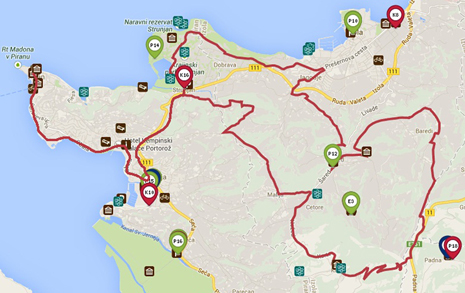 Iz Pirana nas pot popelje ob obali, mimo Bernardina, Portoroža (kjer zavijemo proti Avditoriju ter prečkamo tunel Parenzane), Strunjana (nadaljujemo ob stranski cesti med njivami), Belvederja, Izole (kjer se pripravimo na vzpon), Šareda (mirno nasleje obdano s kar nekaj narave ter lepimi razgledi), Baredov, Kort (stara vasica s čudovito arhitekturo ter naravo), Malije, Strunjana, Portoroža, Bernardin ter nazaj v Piran.